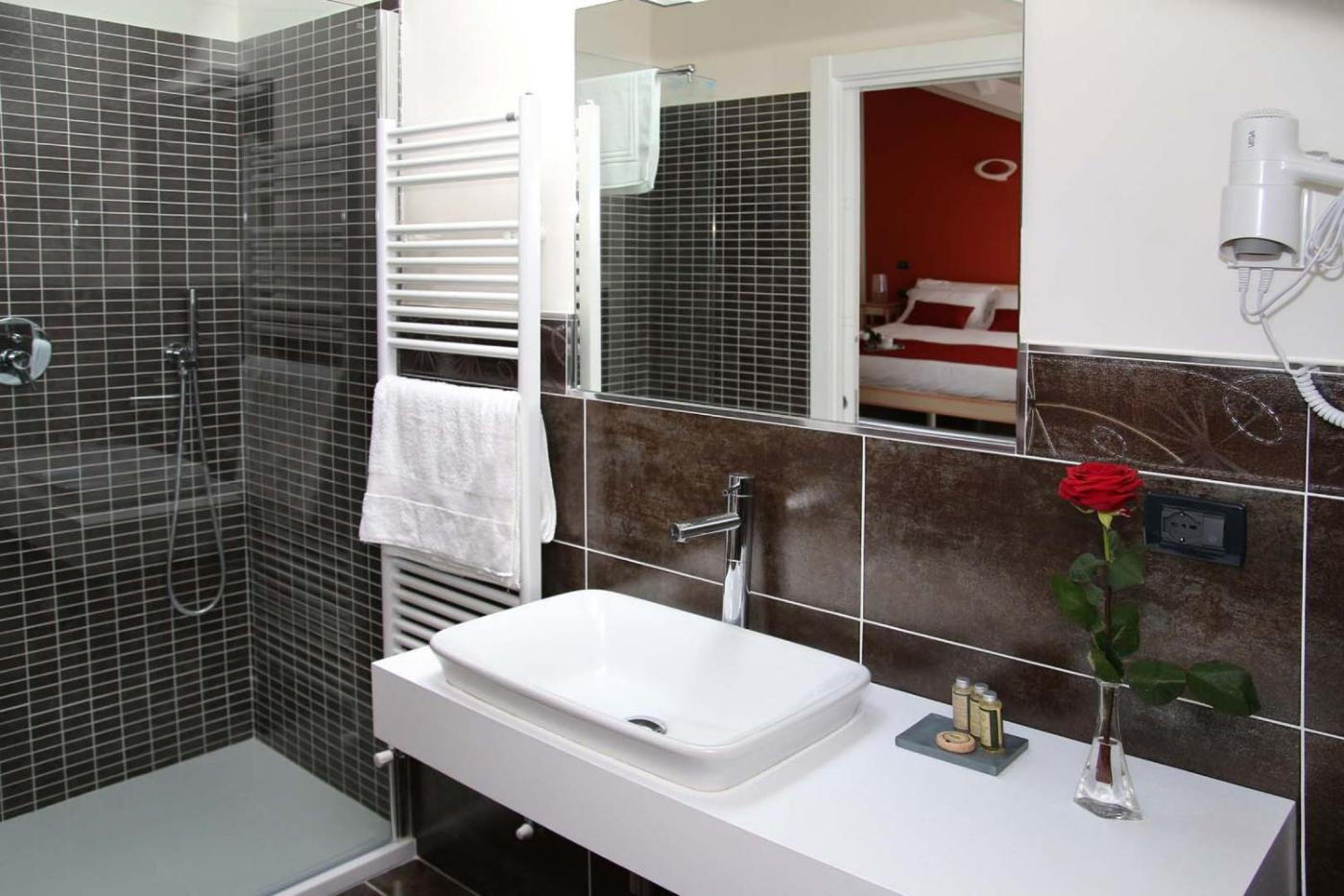 Camera Matrimoniale Deluxe con Balcone. Camera matrimoniale climatizzata con ingresso indipendente dotata di terrazza con vista sulla cittĂ e bagno privato con doccia a filo pavimento. Lalloggio dispone di 2 letti.