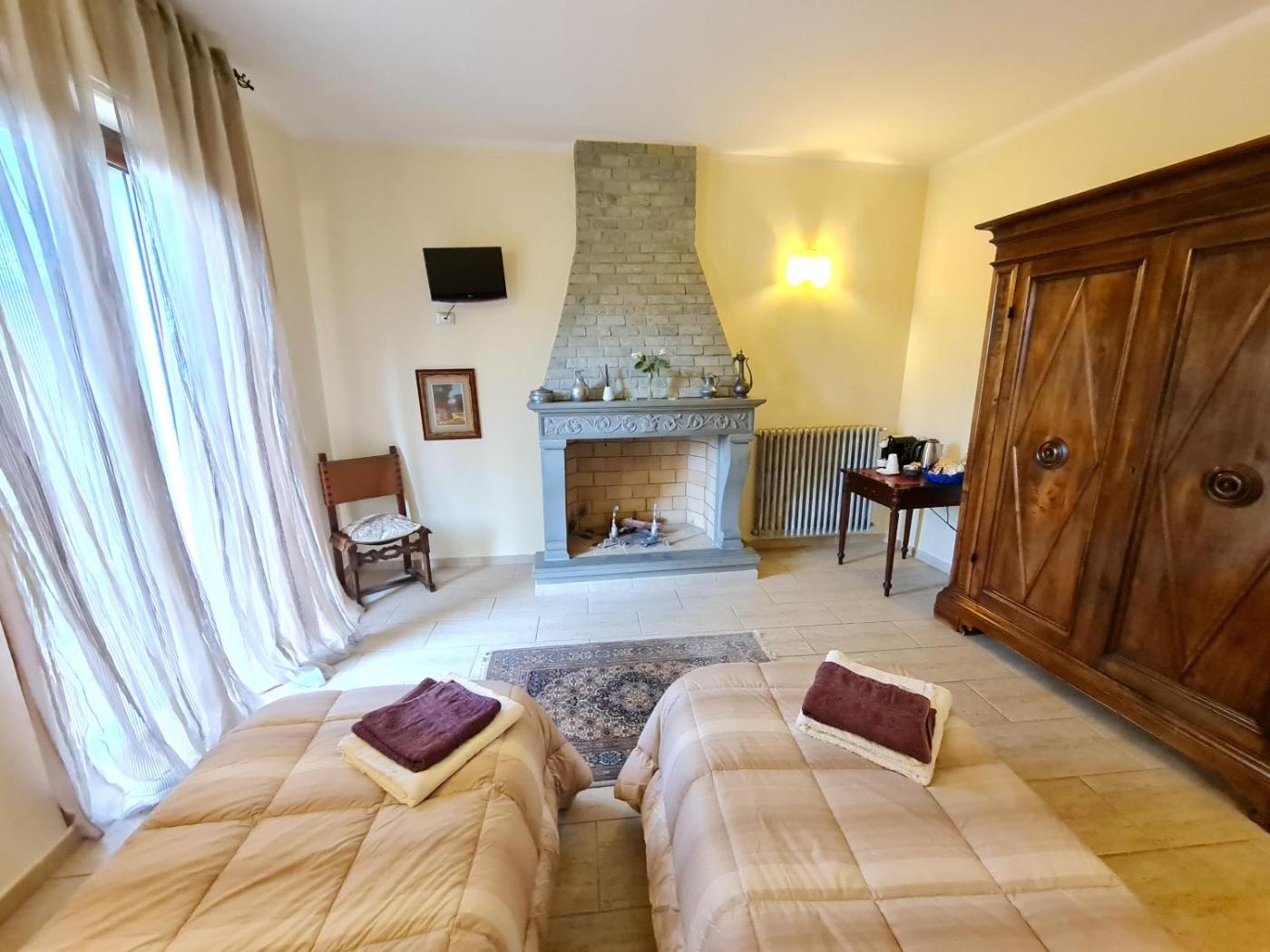 Camera Matrimoniale con Bagno Privato Esterno. Offering a balcony with garden views, this room features a flat-screen TV with Play Station, a decorative fireplace, and a bathroom. ;