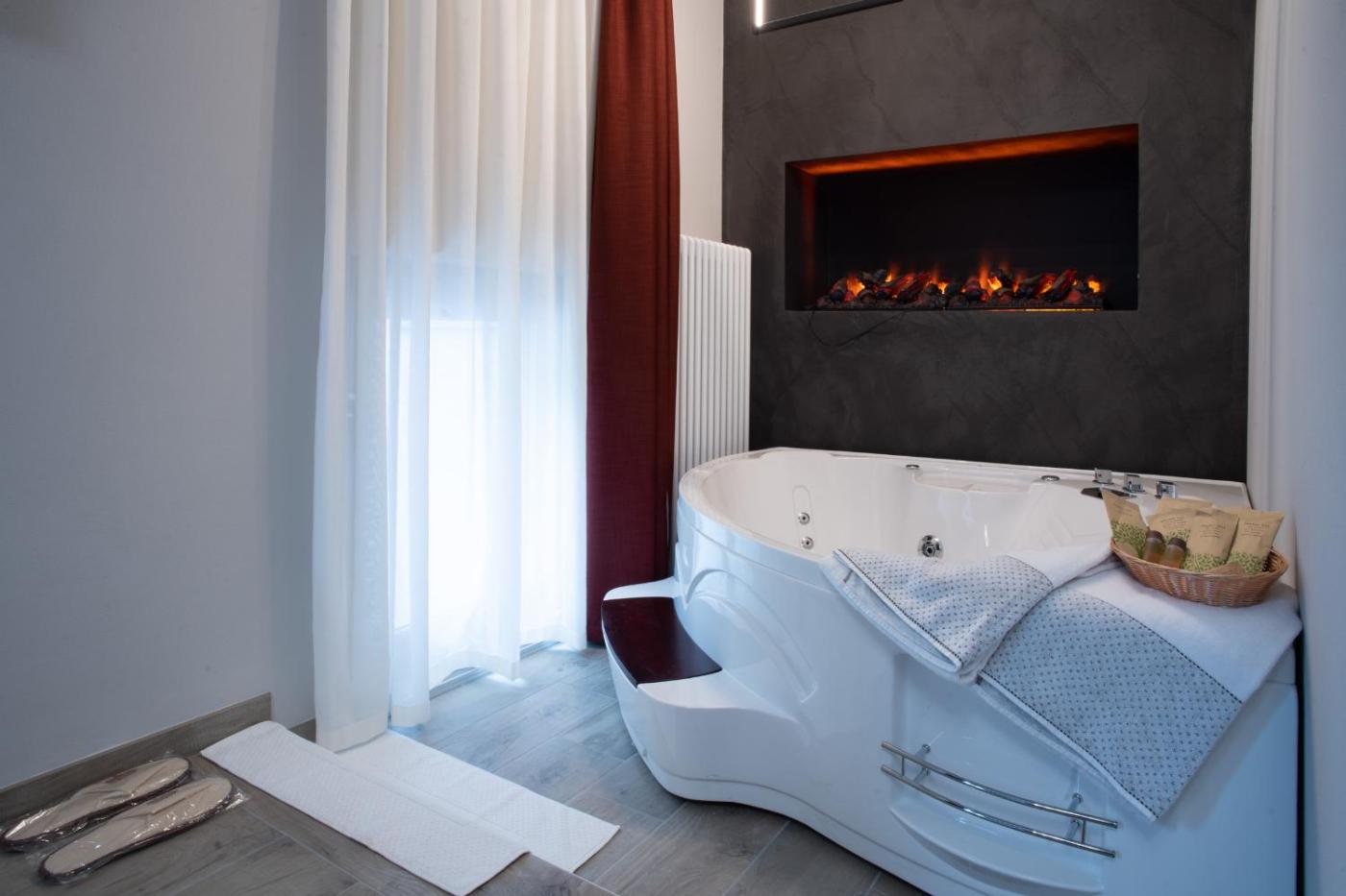 Suite con Vasca Idromassaggio. This suites standout features are the hot tub and fireplace. This spacious suite consists of 1 living room, 2 separate bedrooms and 1 bathroom with a bath and free toiletries. The air-conditioned suite provides a flat-screen TV with streaming services, a minibar, a seating area, a wardrobe as well as a quiet street view. The unit offers 4 beds. ;