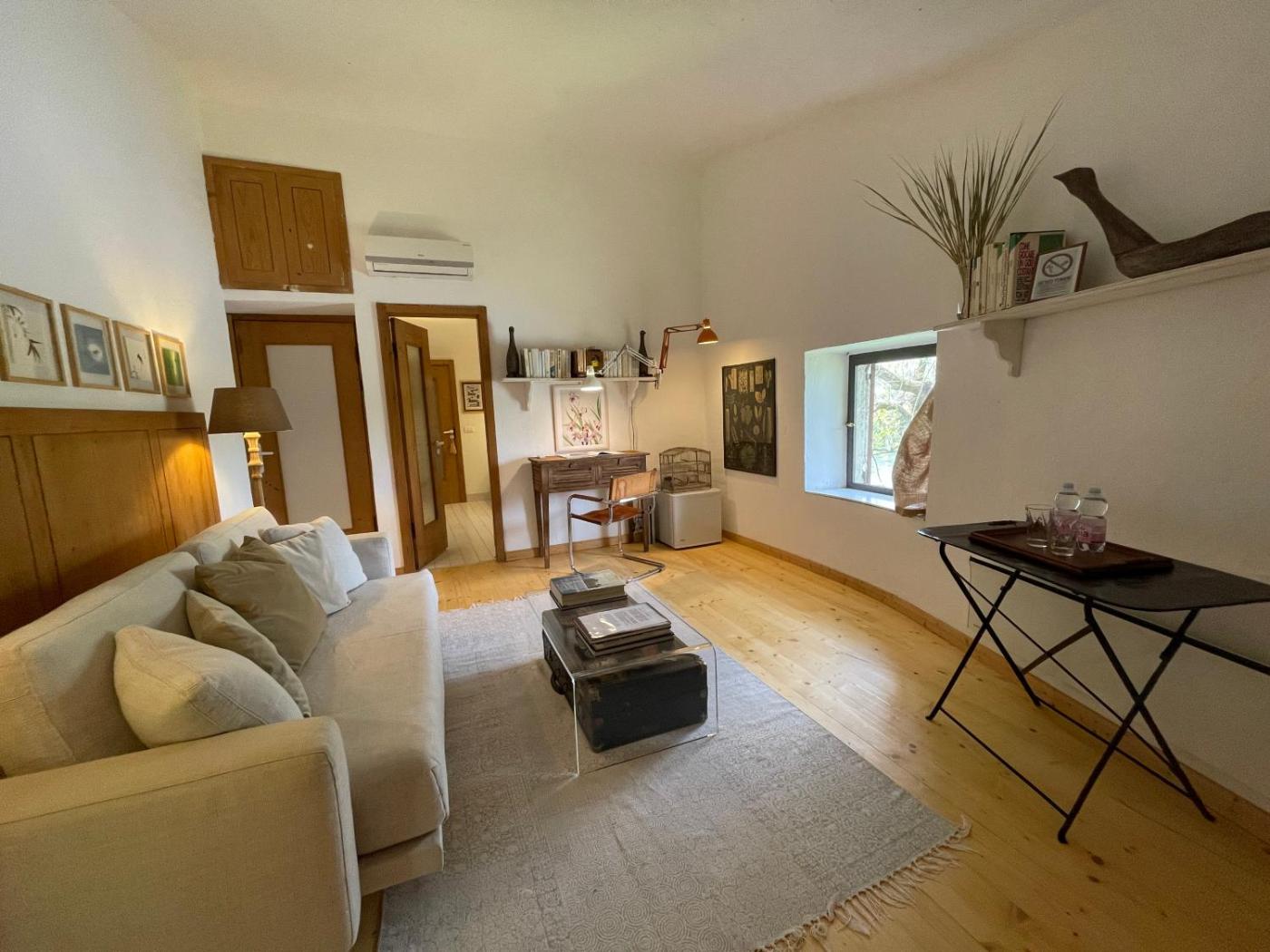 Camera Matrimoniale con Vista Giardino. Disposta su 2 livelli, questa camera è arredata in stile country-chic con numerosi elementi in legno. Questa camera dispone di ingresso privato, connessione WiFi gratuita, soggiorno, piccola biblioteca e frigorifero. Siete pregati di notare che la struttura presenta una scala a chiocciola.